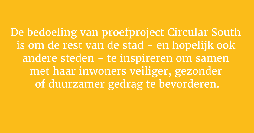 In dit kader hebben wij vanuit de stad Antwerpen het proefproject Circular South opgezet met een slimme manier van nudging waarin de bewoners zelf de hoofdrol zullen spelen. In de energievriendelijke groene wijk Nieuw Zuid wijk starten we de komende jaren een aantal experimentele initiatieven die de circulaire economie in de stedelijke praktijk brengen.
