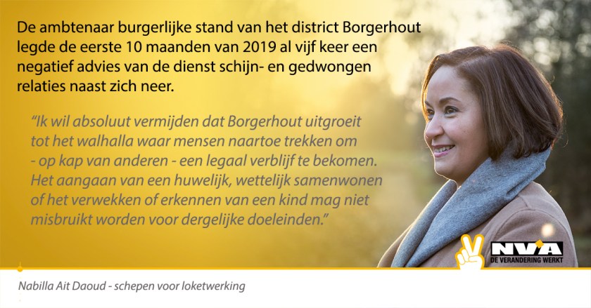 “Als schepen voor loketwerking, waaronder de dienst schijn- en gedwongen relaties en het afleveren van de nodige documenten valt, vraag ik me af waarom het advies van experten ter zake niet gevolgd wordt. Ik wil absoluut vermijden dat Borgerhout uitgroeit tot het walhalla waar mensen naartoe trekken om – op kap van anderen – een legaal verblijf te bekomen. Het aangaan van een huwelijk, wettelijk samenwonen of het verwekken of erkennen van een kind mag niet misbruikt worden voor dergelijke doeleinden”, besluit Nabilla Ait Daoud.