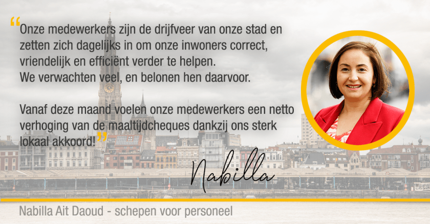 Met het oog op een nieuwe legislatuur en een hernieuwde samenwerking tussen de stad en de vakbonden werd een nieuw lokaal sectoraal akkoord bereikt op 6 december 2019 tussen de stad Antwerpen en de vakbonden ACOD en ACV-OD. Deze week voelen onze medewerkers de positieve impact onder de vorm van meer koopkracht: het bedrag van de maaltijdcheques werd verhoogd tot 8 euro per cheque. De uitbetaling hiervan gebeurt in de loop van deze week.