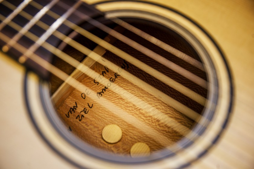 Niet alleen het hout en de sokkel maken van de gitaar een bijzonder Antwerps product. In de gitaar staat een tekst van dé Antwerpse troubadour Wannes Van de Velde gelaserd, in zijn eigen handschrift: “De klank van de stad maakt mijn ziel amoereus”. De vzw Erfgoed Wannes Van de Velde gaf het museum hiervoor toestemming.